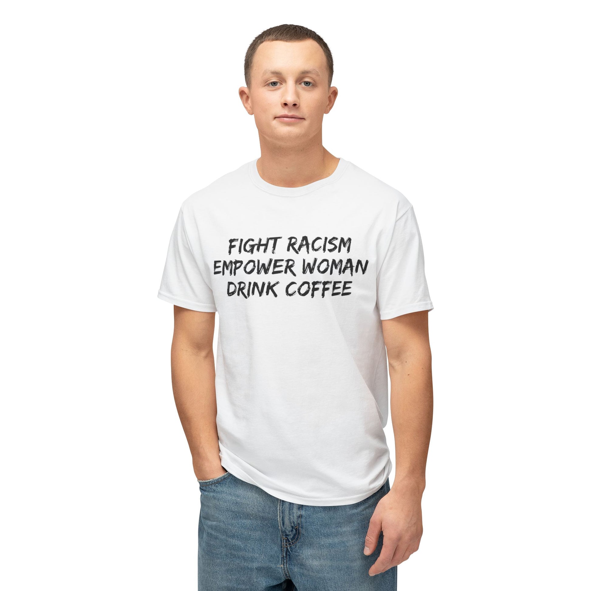 This T-shirt sends a powerful message about fighting racism, empowering women, and enjoying a good cup of coffee. It exudes a strong and empowering vibe, perfect for those who value equality and empowerment in their daily lives. Ideal for activists, feminists, and coffee lovers. Relevant for protests, International Women's Day, and everyday wear.