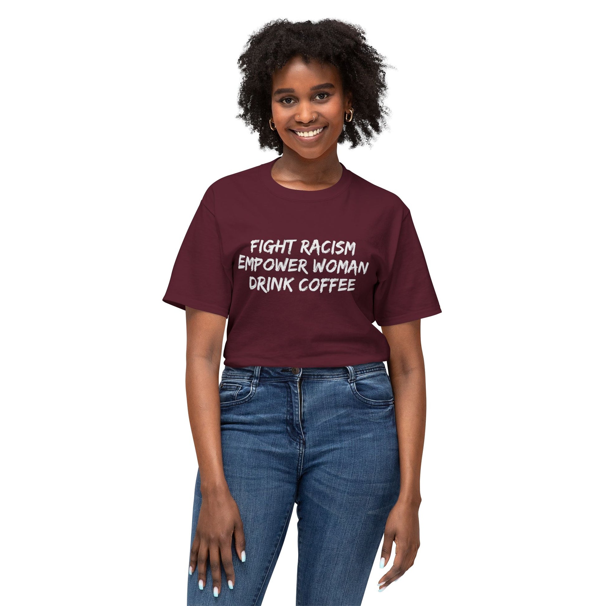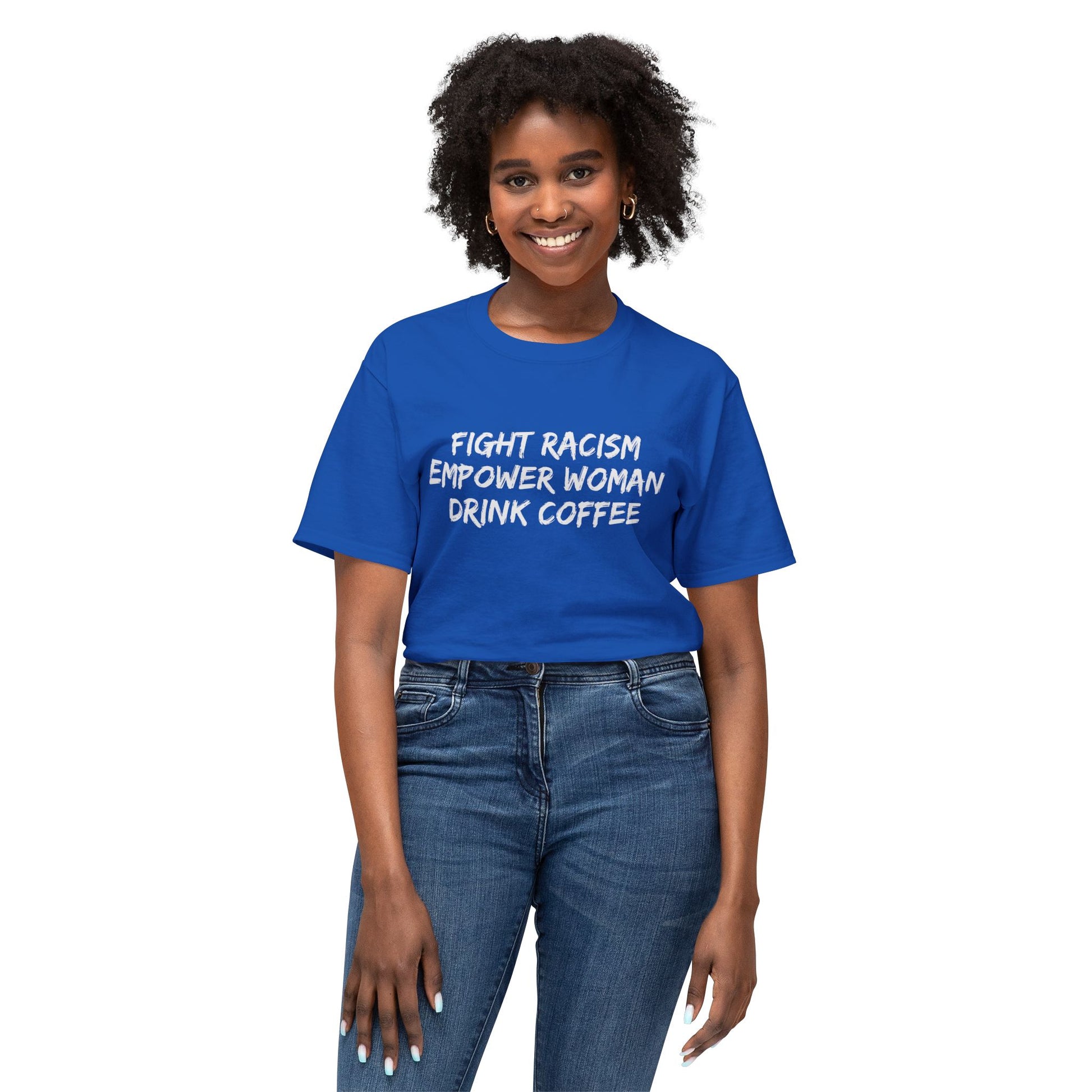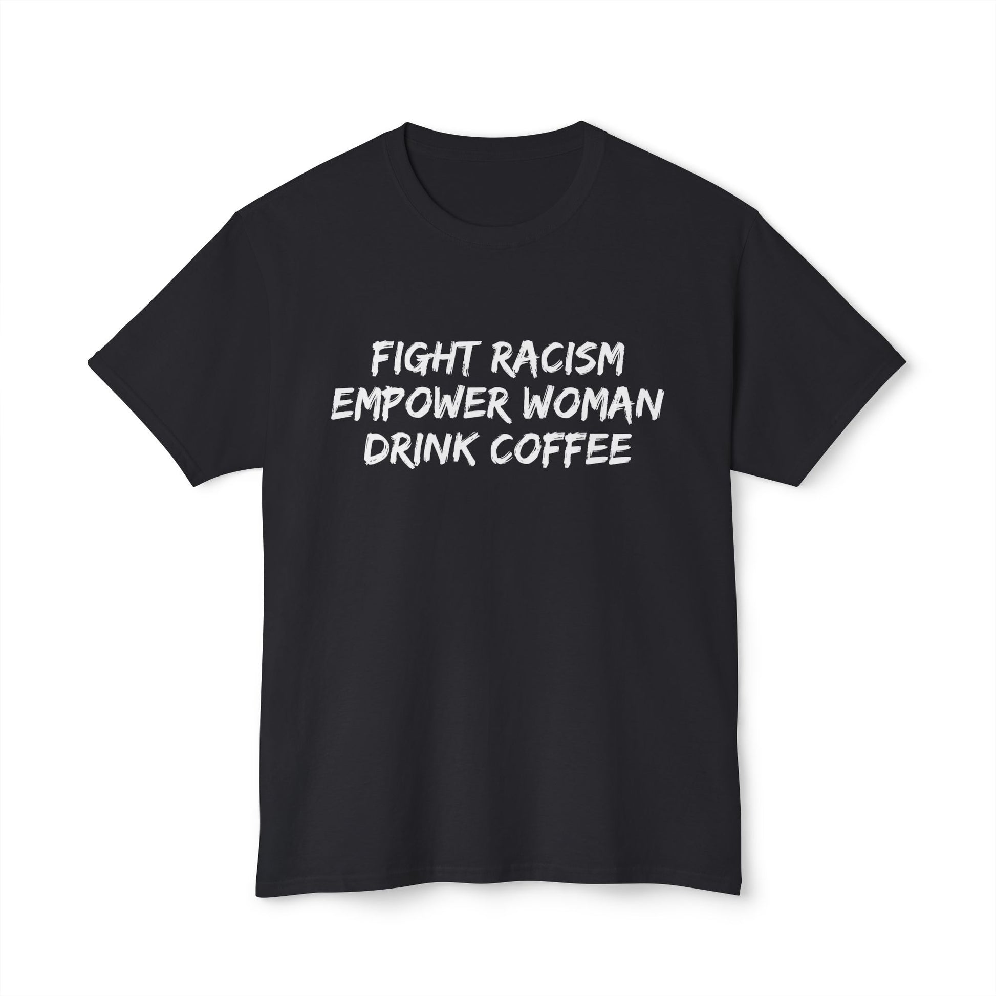 This T-shirt sends a powerful message about fighting racism, empowering women, and enjoying a good cup of coffee. It exudes a strong and empowering vibe, perfect for those who value equality and empowerment in their daily lives. Ideal for activists, feminists, and coffee lovers. Relevant for protests, International Women's Day, and everyday wear.