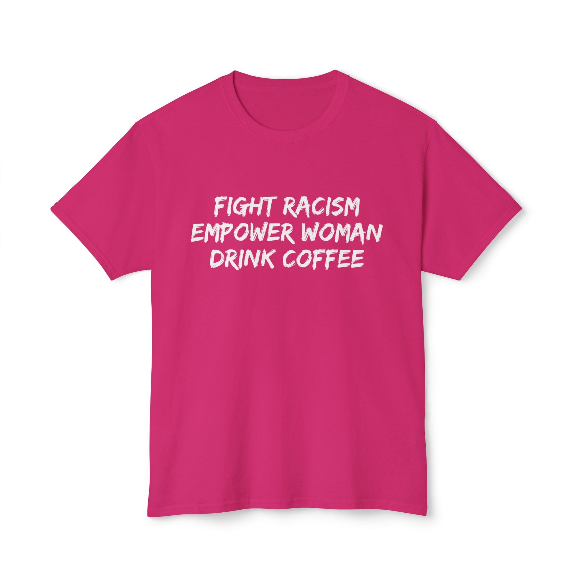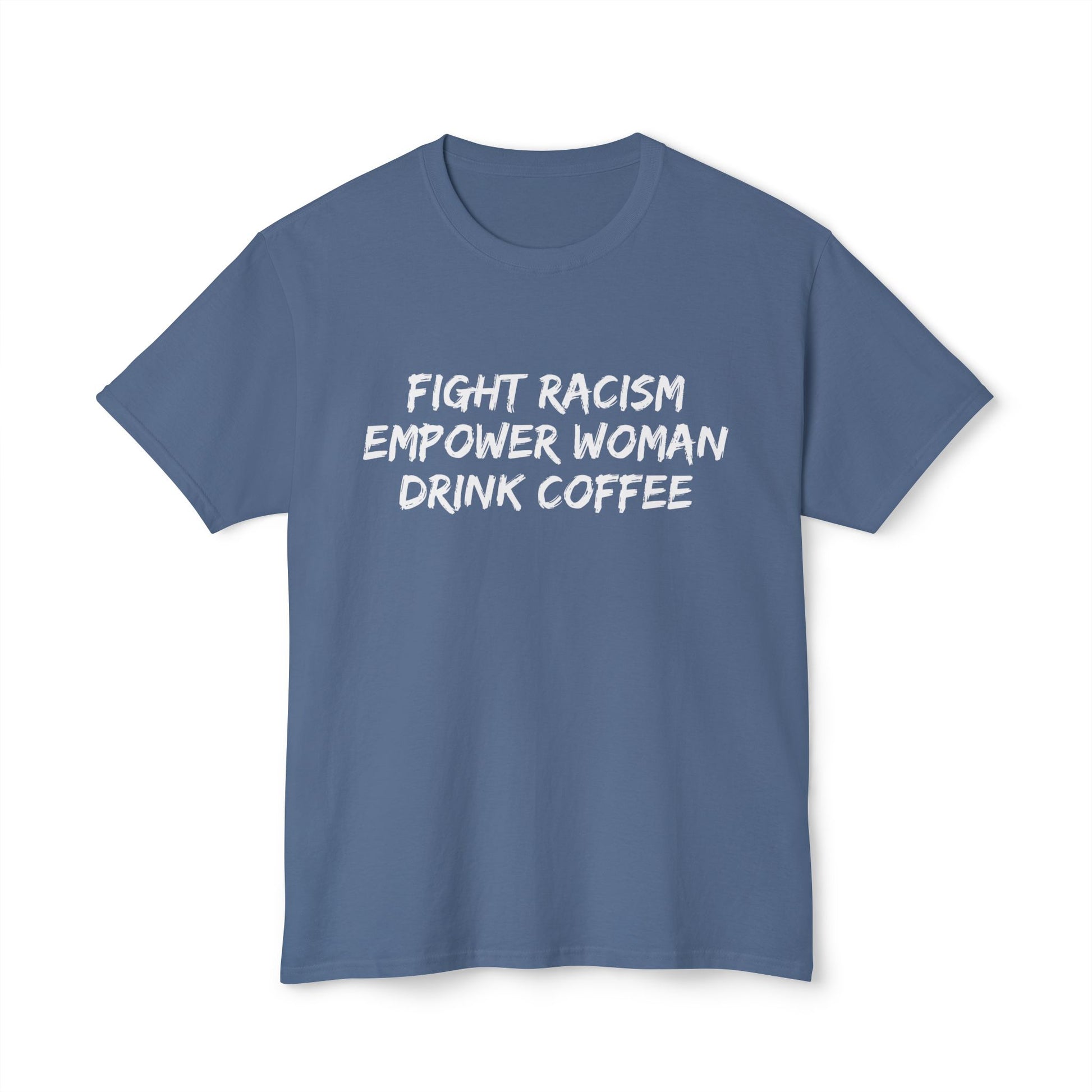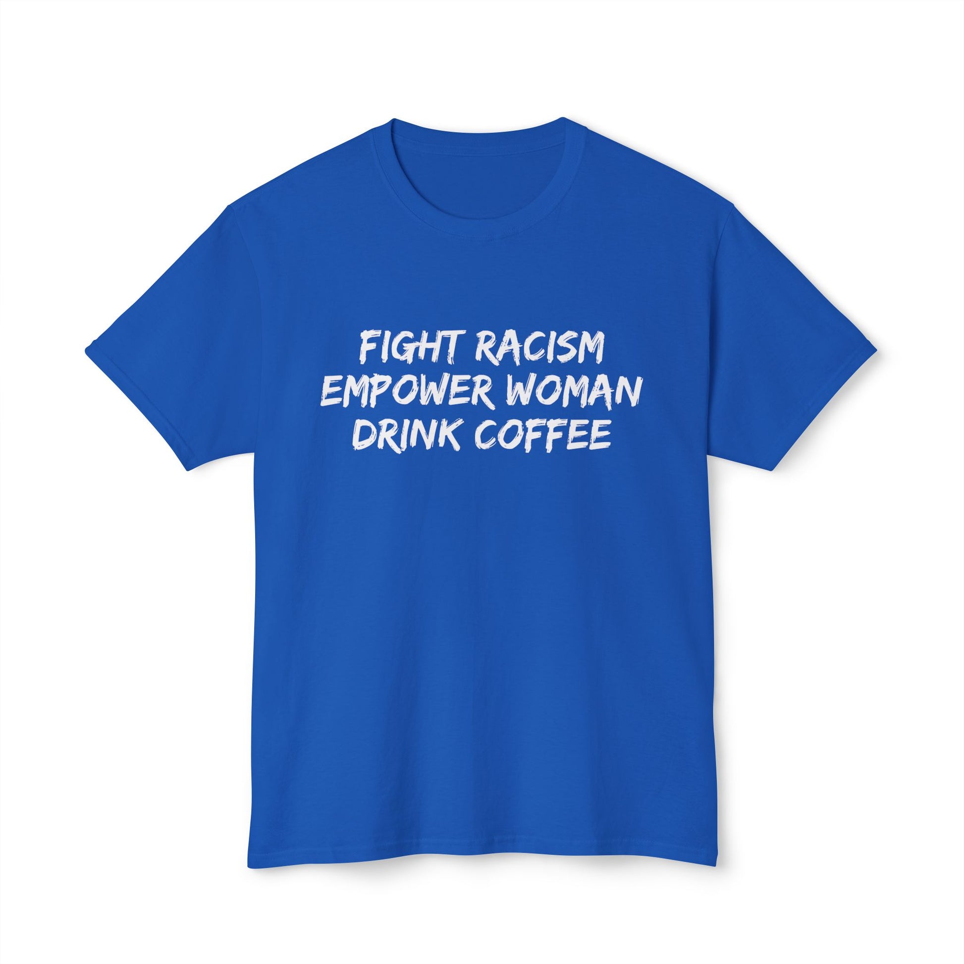 This T-shirt sends a powerful message about fighting racism, empowering women, and enjoying a good cup of coffee. It exudes a strong and empowering vibe, perfect for those who value equality and empowerment in their daily lives. Ideal for activists, feminists, and coffee lovers. Relevant for protests, International Women's Day, and everyday wear.